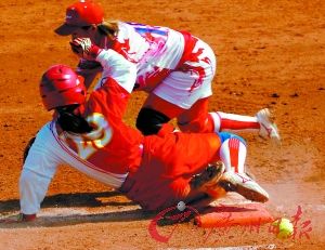 中國隊郭佳(下)在比賽中撲壘。 本報資料圖片