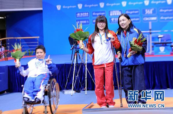 12月14日,冠軍中國(guó)選手崔哲(中)、亞軍菲律賓選手阿切列 吉翁(左)和季軍哈薩克斯坦選手卡比拉 阿斯卡洛娃在頒獎(jiǎng)儀式上。當(dāng)日,在2010年廣州亞殘運(yùn)會(huì)女子44公斤級(jí)舉重比賽中,中國(guó)選手崔哲以95.0公斤的成績(jī)奪得金牌。新華社記者范長(zhǎng)國(guó)攝