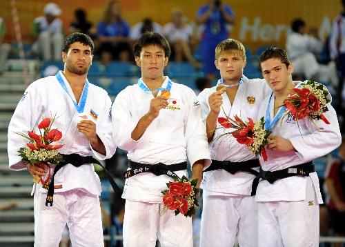 8月14日,冠軍日本選手川上智弘(左二)、亞軍阿塞拜疆選手阿利姆(左一)、季軍俄羅斯選手穆拉特(右二)和巴西選手奧利韋拉在頒獎儀式上。新華社記者 劉大偉 攝