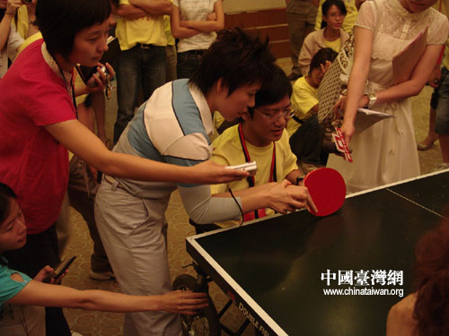 中國臺(tái)灣網(wǎng)8月23日北京消息 參加“兩岸青年攜手迎奧運(yùn)”交流活動(dòng)的代表們22日上午與三位奧運(yùn)會(huì)冠軍在北京齊聚一堂。兩岸青年與睿智善言的鄧亞萍、詼諧幽默的楊凌、美麗動(dòng)人的楊揚(yáng)交流并得以與之切磋球技。