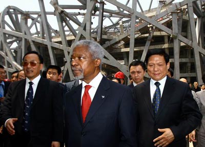 安南(中)在劉淇(右)等陪同下參觀鳥巢工地