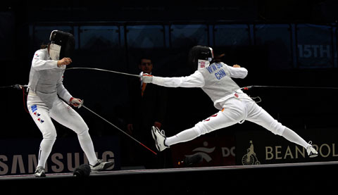 12月14日,中國隊選手蘇婉文(右)在比賽中進攻。當日,在多哈亞運會女子花劍團體決賽中,中國隊以37比45負于韓國隊獲得銀牌。新華社記者陳曉偉攝