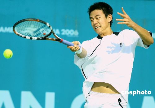 十二月五日,第十五屆多哈亞運會男子網(wǎng)球團體四分之一決賽,中國臺北隊以二比零戰(zhàn)勝菲律賓隊,挺進四強。圖為中國臺北運動員王宇佐在比賽中。