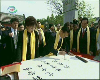 連戰(zhàn)一行于4月16日下午抵達鄭州,18日晚出席了丁亥年黃帝故里拜祖大典歡迎晚宴并欣賞拜祖大典音樂會。今天,連戰(zhàn)夫婦在中共中央臺辦主任陳云林的陪同下入場,并為大典題字。大典開始后,佩戴黃帝絲巾的連戰(zhàn)夫婦齊步趨前,恭敬地向黃帝像敬獻花籃,并凈手點火上香,鞠躬參拜。