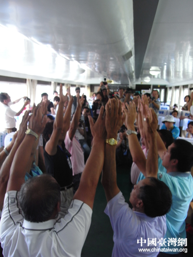 臺灣文化界人士在漓江上合影留念(中國臺灣網(wǎng) 蕪?fù)?攝)