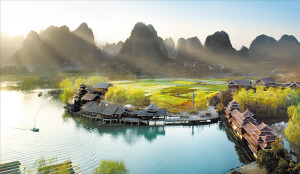 被譽為“夢中的香格里拉”的陽朔世外桃源景區(qū),神奇地再現(xiàn)了晉朝詩人陶淵明筆下的世外桃源勝境。(黃應(yīng)貴/攝)