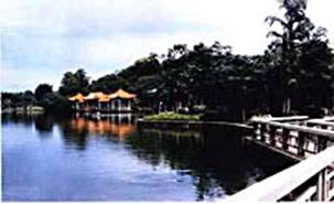 與滿山青翠的樹木相映襯的是山腰上天池和瑤池這兩個巨大的人工湖。天池面積達(dá)15000平方米,水深2—3米,池水波光粼粼,青松翠柏、藍(lán)天白云倒影水中。池中小島建有宜棲亭和盼鵲亭,微風(fēng)輕拂,正是上得山來的游人歇息的好去處,幊匚挥诠┯袎炎迮衤寮、聰明女神布劣陀和勇敢之神布伯三尊石神像的佛堂“三寶堂”東邊,面積有5000平方米,池中立有王母娘娘塑像2座,東沿岸的花崗巖青石上刻有八仙聚會瑤池的浮雕圖,形態(tài)栩栩如生。池周圍種有一片桃林,游人若是春天到此游玩,便可觀賞桃花盛開的美景。天池和瑤池,加上滿山翠木,使青秀山成為一個巨大的天然空氣調(diào)節(jié)器,成為南寧市區(qū)呼吸新鮮空氣的“巨肺”。