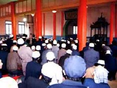 回族全民信奉伊斯蘭教,禁食豬肉 ,開齋節(jié)、古爾邦節(jié)、圣紀(jì)節(jié)是回族的三大節(jié)日;刈逵刑厥獾膯试崃(xí)俗,人死說無常,或說“冒臺(tái)” 。 死人謂亡人。一般行土葬,即不用棺槨盛,先將亡人置于水溜子上,用湯瓶沖洗,再纏以“可蕃”(白布)放入埋臺(tái),舉行殯禮, 拉往墳地“刺亥兒”,墳丘砌成長方形墩,回族喪葬倡導(dǎo)速葬、薄葬;刈迥凶酉矏鄞靼咨蚝谏珶o檐帽,熱天則身穿白褂,外套黑馬甲,黑白分明,干凈利落;婦女戴蓋頭,不使頭發(fā)、耳朵、頸脖外露,以顯本分莊重。根據(jù)個(gè)人年齡和婚姻狀況,蓋頭有顏色區(qū)分,一般老年人戴白蓋頭,中年人戴黑蓋頭,青年女子或未婚女孩則戴綠蓋頭(綠色是吉祥色)。在城市里,除少數(shù)老年人戴蓋頭外,多數(shù)回族婦女戴白帽,或各色頭巾。