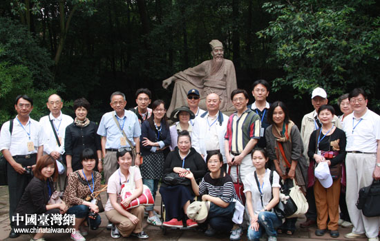 13日,情系巴蜀—兩岸文化聯(lián)誼行活動走進(jìn)眉山三蘇祠。圖為臺灣嘉賓在蘇軾雕像前合影。(中國臺灣網(wǎng) 趙輝 攝)