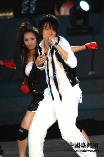 備受矚目的“山莊月·中華情”2007中秋晚會將于今晚在承德避暑山莊舉行。24日晚,劇組進(jìn)行了最后彩排。圖為林俊杰勁歌熱舞參加彩排。(中國臺灣發(fā))