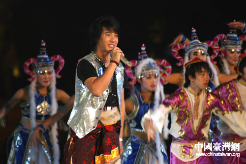 備受矚目的“山莊月·中華情”2007中秋晚會將于今晚在承德避暑山莊舉行。24日晚,劇組進(jìn)行了最后彩排。圖為藏族好男兒蒲巴甲載歌載舞。(中國臺灣發(fā))