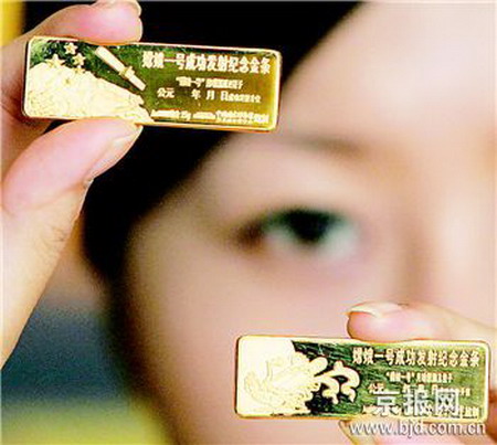 “嫦娥一號(hào)”勝利升空,24日下午,限量發(fā)行2007套的“嫦娥金條”正式上市。具有唯一限量編號(hào)的每套“嫦娥一號(hào)”紀(jì)念金條含兩根25克AU9999金條。第一根金條精雕象征中華民族的萬(wàn)里長(zhǎng)城、五星紅旗和“嫦娥一號(hào)”在太空飛行的姿態(tài);第二根金條雕刻有嫦娥奔月的傳統(tǒng)神話(huà)圖案,寓意國(guó)人千年的夢(mèng)想開(kāi)始變成現(xiàn)實(shí)。金條背面雕刻的是“嫦娥一號(hào)”在太空的運(yùn)行圖。中國(guó)國(guó)家博物館藝術(shù)品開(kāi)發(fā)中心監(jiān)制了這套“嫦娥一號(hào)”紀(jì)念金條。記者閻彤?dāng)z