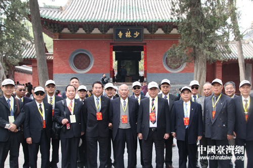 黃埔軍校同學(xué)會(huì)會(huì)長(zhǎng)林上元(前排中)與王文燮上將(右四)等退役將領(lǐng)在少林寺山門前合影留念(中國(guó)臺(tái)灣網(wǎng) 趙輝 攝)