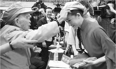 在海南瓊州,101歲的“紅色娘子軍”老戰(zhàn)士王運梅為芭蕾舞演員朱妍戴上軍帽。