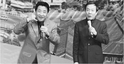 在福建南安,姜昆、戴志成為大家表演相聲。