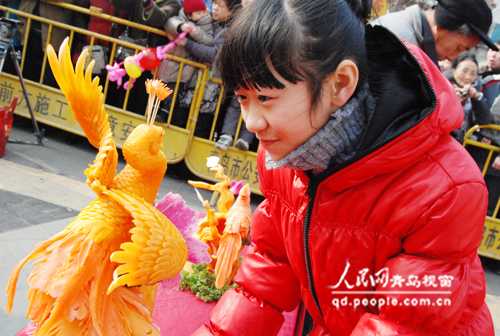 人民網(wǎng)青島2月11日電 (記者 楊紅) 今天,素有“青島新春第一節(jié)”之稱的2011青島(市北)蘿卜會·元宵山會拉開帷幕。清脆的蘿卜,唯妙唯肖的蘿卜雕刻、各地特色小吃、傳統(tǒng)高蹺、民間大鼓等吸引了數(shù)萬市民前來參會。