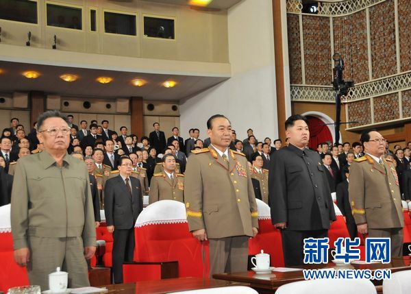 圖為朝鮮最高領(lǐng)導(dǎo)人金正日(左一)、朝鮮勞動(dòng)黨中央政治局常委、人民軍總參謀長(zhǎng)李英浩(左二)、勞動(dòng)黨中央軍事委員會(huì)副委員長(zhǎng)金正恩(左三)等在元宵節(jié)音樂(lè)會(huì)上。新華社記者高浩榮攝