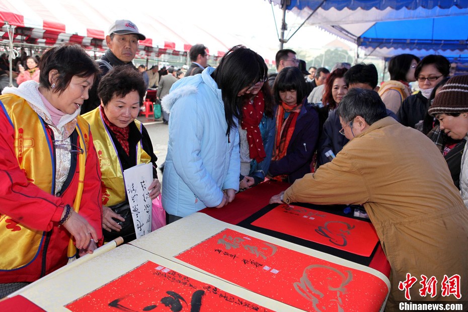 2月12日下午,冒著冷風(fēng)細雨,臺灣數(shù)千名書法家及愛好者在臺北揮毫,迎接辛卯新春,F(xiàn)場翰墨飄香,展現(xiàn)書藝傳承,充滿文化氣息。中新社記者 董會峰 攝