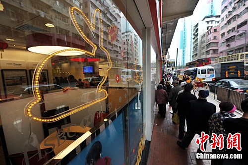 1月24日,香港市民在銀行門前排長隊等候換新鈔。因應市民春節(jié)派發(fā)利是需求,香港三家發(fā)鈔銀行已開始為市民提供換新鈔服務(wù)。中新社記者 鄭祚聲 攝