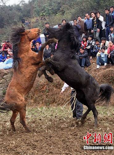 2月8日,廣西融水縣安太鄉(xiāng)培地苗寨舉行斗馬比賽。近20匹駿馬激烈的咬、踢、追等扣人心弦的格斗,吸引眾多游客到場觀看!岸否R”已有500多年歷史,是當(dāng)?shù)孛缱逋麨椴脹Q婚姻而設(shè),現(xiàn)演變?yōu)橐豁?xiàng)娛樂活動(dòng)。龍林智 攝 圖片來源:CNSPHOTO