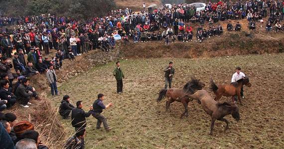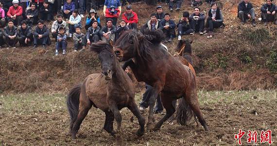 2月8日,廣西融水縣安太鄉(xiāng)培地苗寨舉行斗馬比賽。近20匹駿馬激烈的咬、踢、追等扣人心弦的格斗,吸引眾多游客到場觀看。“斗馬”已有500多年歷史,是當(dāng)?shù)孛缱逋麨椴脹Q婚姻而設(shè),現(xiàn)演變?yōu)橐豁?xiàng)娛樂活動(dòng)。龍林智 攝 圖片來源:CNSPHOTO