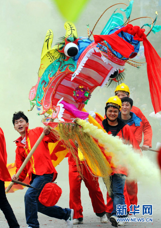 2月16日,德江縣街頭,一支舞龍隊(duì)伍在表演。當(dāng)日,貴州省德江縣的10萬(wàn)土家族群眾走上街頭舞龍燈、演儺戲、扭秧歌,喜迎元宵節(jié)。 新華社記者 劉續(xù) 攝
