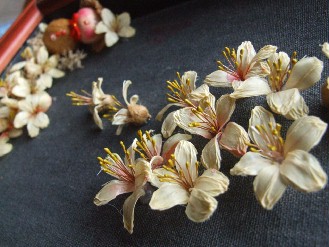 用柚子的種子皮做成的油桐花維妙維肖,乍看之下分不出真假。