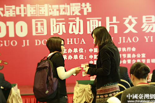 兩名商戶在國際動畫片交易會上接洽。(中國臺灣網(wǎng) 李桂英 攝)