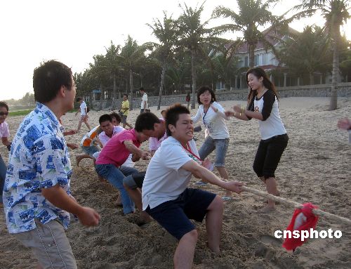 第二屆“歡聚海南大學(xué)”兩岸大學(xué)生冬令營11月13日舉行“深深相連”沙灘拔河比賽活動(dòng)。圖為臺(tái)灣學(xué)生奮力拔河,粉絲團(tuán)在旁邊吶喊助威。 中新社發(fā) 彭小云 攝