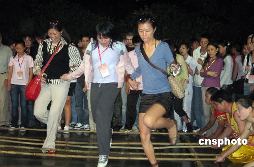 第二屆“歡聚海南大學(xué)”兩岸大學(xué)生冬令營活動(dòng)11月12日開始海口之旅。來自臺(tái)灣五所高校的五十多位師生和海南大學(xué)等三所大陸高校師生一同跳起黎族竹竿舞。 中新社發(fā) 彭小云 攝