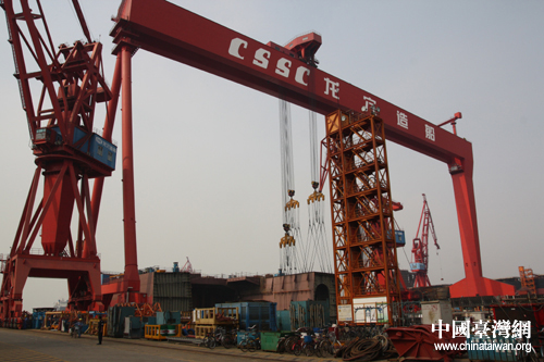 龍穴造船基地的龍門吊,承重力達(dá)600噸,并可實(shí)現(xiàn)多臺(tái)自由拼裝組合(中國(guó)臺(tái)灣網(wǎng) 趙輝 攝)