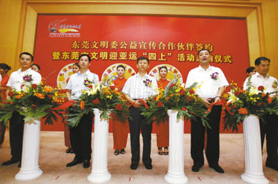 昨日(20日),東莞市正式啟動了包括禮儀知識上電視、公益宣傳上電影、公共禮儀上窗口、文明出行上大巴在內(nèi)的文明迎亞運“四上”活動,進一步拓展了公益宣傳的新陣地。另外,中國移動?xùn)|莞分公司、東莞新奧燃氣等25家企業(yè)正式簽約,成為東莞文明委公益宣傳合作伙伴單位。這些企業(yè)承諾積極投身文明創(chuàng)建,廣泛參與公益宣傳,樹立了良好的企業(yè)形象,實現(xiàn)了政企共贏的良性循環(huán)。市委常委、宣傳部部長、市文明委副主任王道平出席了啟動儀式。