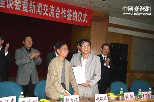海南省新聞工作者協(xié)會(huì)副主席兼秘書(shū)長(zhǎng)郭澤福與臺(tái)南縣記者協(xié)會(huì)理事林琨璋(右二)