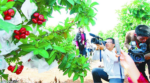 11月29日,在海口市臺(tái)資企業(yè)金德豐蓮霧基地,兩岸新聞媒體記者紛紛拍攝蓮霧果。( 海南日?qǐng)?bào) 李英挺 攝)