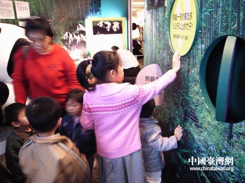 臺(tái)灣小朋友在臥龍熊貓區(qū)與展品親密接觸