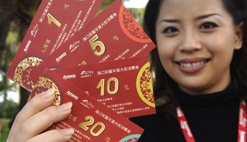 2月8日,臺灣游客在展示年貨購物券。當日,1600多名臺灣游客搭乘排水量7萬噸級的豪華郵輪“海洋神話號”抵達海南省省會?谑袇⒂^游覽。為使臺灣游客直觀地感受海南,海南省旅游部門專門為臺灣游客開設了年貨大街和迎春會,將海南特產(chǎn)、美食和少數(shù)民族文化藝術集中一地,供臺灣游客購買、品嘗、觀賞。新華社記者 趙穎全 攝
