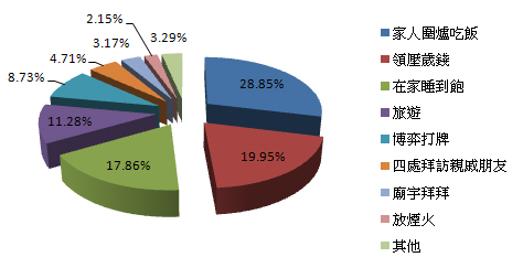 調(diào)查顯示,其次是“領(lǐng)壓歲錢”19.95%,第三則是“在家睡到飽”17.86%,“旅游”以11.28%占第四,“博奕打牌”居第五8.73%。農(nóng)歷年多數(shù)受訪者還是有著“團(tuán)圓”的傳統(tǒng)觀念,期待與家人團(tuán)聚吃飯聊天,小朋友當(dāng)然最開(kāi)心的就是領(lǐng)壓歲錢,可以去買喜歡的東西。