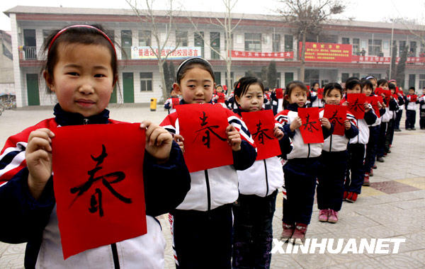 當(dāng)日,河北省廣平縣明德小學(xué)500名學(xué)生用自己書(shū)寫(xiě)的書(shū)法作品,拼成一個(gè)巨型“春”字,以“迎春接!钡姆绞较灿麓杭压(jié)。新華社發(fā)(程學(xué)虎 攝)