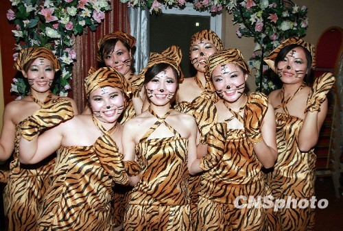 2010年2月4日晚,河南鄭州,7只美麗的“老虎”在舞臺上表演千手觀音等節(jié)目,這些“老虎”都是由鄭州某醫(yī)院的女護(hù)士變身而成,為了迎接虎年新春的到來,她們自己制作出虎皮等飾品裝扮成老虎模樣虎虎生威迎新春。王中舉 攝
