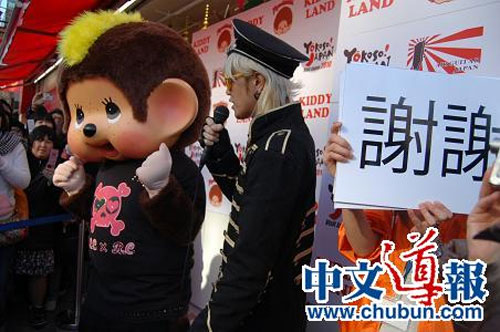 1月30日下午2時(shí),身穿旗袍的主持人小田小姐宣布“Yokoso! Japan year2001年冬季宣傳活動(dòng)”開始,接著由MAY等“空氣吉他日本”的成員做精彩表演,最后蒙奇奇出場(chǎng),蒙奇奇的后面有人舉著用中文寫成的展示它的身體語言所表現(xiàn)的意思的牌子,場(chǎng)上氣氛十分熱烈。(張石)