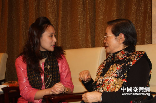 出席海峽兩岸京劇藝術(shù)論壇的臺(tái)灣;鶗(huì)前董事長辜振甫遺孀、臺(tái)灣中華婦聯(lián)總會(huì)主任委員辜嚴(yán)倬云,在兩岸京劇票友聯(lián)誼活動(dòng)現(xiàn)場演唱《鎖麟囊》選段春秋亭。(中國臺(tái)灣網(wǎng) 董潔 攝)