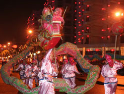 隨著兩只黃色巨龍騰空而舞,相隔近一個世紀的中國“民間花會踩街”再現(xiàn)京城前門大街。十二只南、北獅搖頭晃腦地開道,并不時向站在紅燈籠下的觀眾致意。...