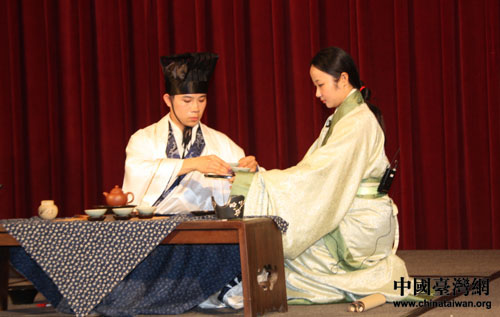 北京孔廟和國子監(jiān)博物館工作人員為兩岸師生作茶道表演。(中國臺(tái)灣網(wǎng) 李杰 攝)