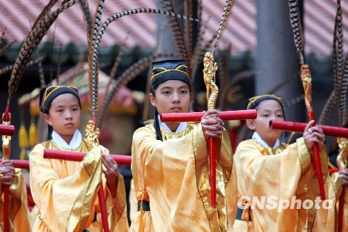 9月28日清晨,臺(tái)北孔廟隆重舉行祭孔大典,紀(jì)念孔子誕辰2559周年;顒(dòng)遵循傳統(tǒng)古禮儀節(jié),分37步驟。圖為多年來(lái)?yè)?dān)任佾生的臺(tái)北大龍小學(xué)生,以六佾舞行獻(xiàn)禮,展現(xiàn)“誠(chéng)于中,形于外”的姿儀,表達(dá)對(duì)孔子的尊崇與贊頌。