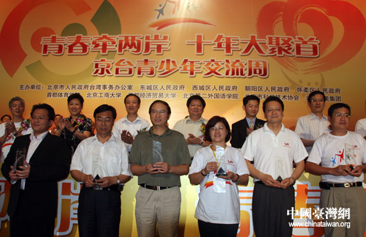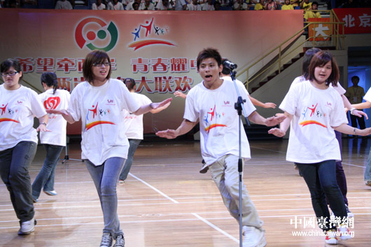 中國(guó)臺(tái)灣網(wǎng)7月15日北京消息 昨晚,“青春牽?jī)砂,十年大聚首——京臺(tái)青少年交流周”暨兩岸青年大聯(lián)歡活動(dòng)在北京大學(xué)生體育館隆重舉行。來自臺(tái)灣大學(xué)、臺(tái)中技術(shù)學(xué)院、屏東商業(yè)技術(shù)學(xué)院、基隆市二信中學(xué)、嘉義東石學(xué)校、新竹中信學(xué)校和國(guó)民黨青年發(fā)展基金會(huì)、臺(tái)灣工藝發(fā)展協(xié)會(huì)、周文鏡文教基金會(huì)、臺(tái)中中小企業(yè)協(xié)會(huì)等社會(huì)團(tuán)體組織的600余名臺(tái)灣師生與北京師生歡聚在一起,度過了難忘的一晚。