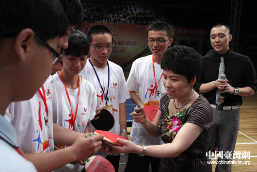 京臺(tái)兩地各派出學(xué)生代表與鄧亞萍進(jìn)行了乒乓球友誼賽。(中國(guó)臺(tái)灣網(wǎng) 鐘寶華 攝 )
