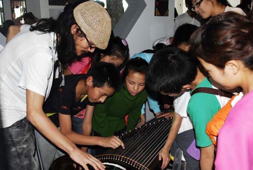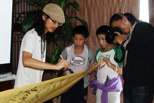 下午2時,被譽為“鬼才”的田七先生帶著筆墨紙硯和古箏出現(xiàn)在22個孩子面前。則熱福利院院長李星陸介紹說,在玉樹地震中,該福利院的院墻都已經(jīng)倒塌,無法使用。在北京市各界人士的關(guān)懷下,該福利院22名孩子來到了北京求學、居住,其中9名是震后孤兒,他們最小的8歲,最大的17歲!敖裉旌芨吲d鬼才田七先生能來的孩子們面前,希望這些心靈受過創(chuàng)傷的孩子們能以田七先生為榜樣,熱愛生活、善于發(fā)現(xiàn)美的東西、傳承國學!”
