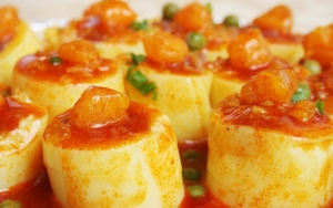 這是一道淮揚(yáng)風(fēng)格的菜式,首先用雞湯與豆?jié){釀制出風(fēng)味別具的秘制豆腐,然后用湯匙做出琵琶造型備用。將大閘蟹蒸熟后,師傅們會(huì)手工剔取其蟹膏、蟹肉、蟹黃,用花雕酒、雞油、蔥、姜等配料精心炒制成蟹粉,然后再與豆腐燴在一起即可。