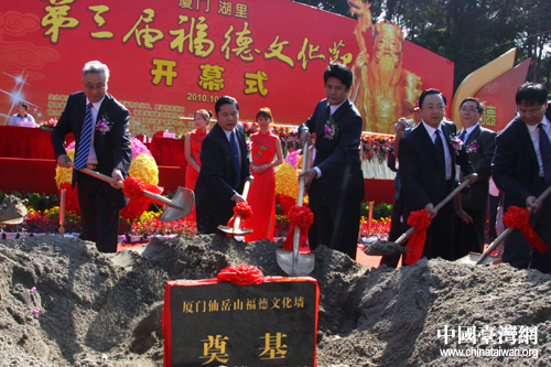 湖里區(qū)委書記李棟梁、福建省海峽文化研究會(huì)會(huì)長(zhǎng)楊華基、臺(tái)灣寺廟金蘭會(huì)會(huì)長(zhǎng)王增榮、新加坡道家總會(huì)會(huì)長(zhǎng)陳添來、廈門市政協(xié)副主席陳昌生先后在開幕式上致辭。海峽兩岸關(guān)系協(xié)會(huì)副會(huì)長(zhǎng)張銘清宣布第三屆福德文化節(jié)開幕并邀請(qǐng)?jiān)趫?chǎng)嘉賓共同推動(dòng)啟動(dòng)桿啟動(dòng)開幕。現(xiàn)場(chǎng)的嘉賓為福德文化墻和海峽兩岸非物質(zhì)文化遺產(chǎn)(仙岳山)展示中心項(xiàng)目奠基儀式培土。