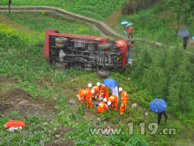 6月20日12時(shí)21分,六盤水市鐘山區(qū)消防特勤中隊(duì)接到指揮中心調(diào)度,稱南環(huán)路桃園山莊下發(fā)生一起交通事故,有兩人被困。消防中隊(duì)接到調(diào)度命令后,立即出動(dòng)9名消防官兵乘坐一臺(tái)搶險(xiǎn)救援車趕往事故現(xiàn)場(chǎng)實(shí)施救援。消防官兵到達(dá)事故地點(diǎn)通過(guò)勘查發(fā)現(xiàn),一輛中型貨車側(cè)翻在公路下玉米地里,車頭已嚴(yán)重變形,包括駕駛員在內(nèi)兩名被困人員均未被車卡住,且神志清醒,能夠積極配合營(yíng)救工作。消防官兵下達(dá)山坡玉米地后,兩名被困人員已被先到現(xiàn)場(chǎng)當(dāng)?shù)厝罕姾?20醫(yī)務(wù)人員抬至擔(dān)架上。消防指揮員根據(jù)現(xiàn)場(chǎng)情況,立即下達(dá)救援方案,利用救援繩小心的將受傷駕駛員和另一名受傷婦女固定在救援擔(dān)架上,并迅速抬至公路上的120急救車,由于方法得當(dāng),整個(gè)過(guò)程進(jìn)展順利,經(jīng)過(guò)近20分鐘的緊張救援,兩名被困人員被成功抬上120急救車。
